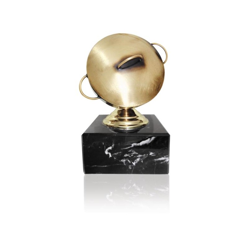 ESCULTURA TROFEO CAZUELA DE COCINA DE LATÓN sobre peana. Un trofeo de calidad, artesanal y original.